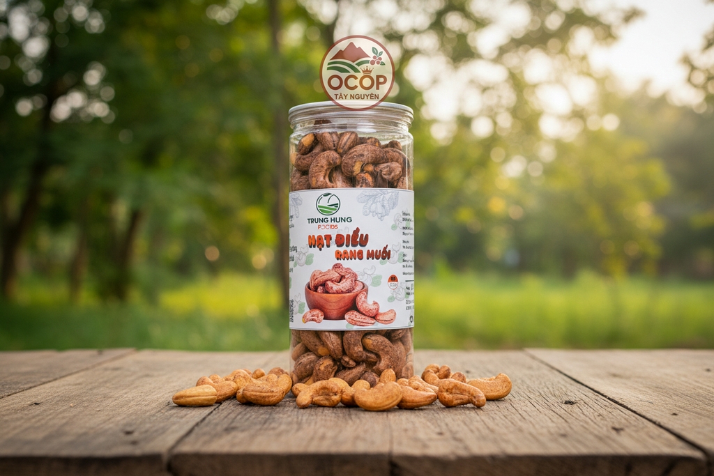 Hạt điều rang muối Trung Hưng được chế biến từ 100% hạt điều chọn lọc tại Đắk Lắk, rang thủ công cùng muối tinh khiết, giữ trọn độ giòn – vị béo – hương thơm đặc trưng của hạt điều Việt Nam.